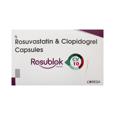 Rosublok CV 10 Capsule is a combination of two medicines used to prevent heart attack and stroke. This medicine reduces the "bad" cholesterol (LDL) and triglycerides (fats) levels. Moreover, it also decreases the formation of harmful blood clots. This medicine should be taken with food to avoid stomach upset. Lifestyle changes like low-fat diet, exercise, and not smoking may help this medicine to work better. It may change liver function and blood sugar levels, so monitor them properly. This medicine increases your risk of bleeding, so it is important to be careful while shaving, cutting nails, using sharp objects, or engaging in contact sports (e.g. football, wrestling). Stomach pain and constipation are some other common side effects associated with this medicine.