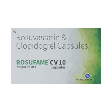 Rosufame CV 10 Capsule is a combination of two medicines used to prevent heart attack and stroke. This medicine reduces the "bad" cholesterol (LDL) and triglycerides (fats) levels. Moreover, it also decreases the formation of harmful blood clots. This medicine should be taken with food to avoid stomach upset. Lifestyle changes like low-fat diet, exercise, and not smoking may help this medicine to work better. It may change liver function and blood sugar levels, so monitor them properly. This medicine increases your risk of bleeding, so it is important to be careful while shaving, cutting nails, using sharp objects, or engaging in contact sports (e.g. football, wrestling). Stomach pain and constipation are some other common side effects associated with this medicine.
