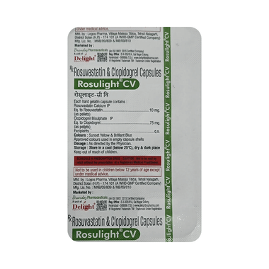 Rosulight CV Capsule is a combination of two medicines used to prevent heart attack and stroke. This medicine reduces the "bad" cholesterol (LDL) and triglycerides (fats) levels. Moreover, it also decreases the formation of harmful blood clots. This medicine should be taken with food to avoid stomach upset. Lifestyle changes like low-fat diet, exercise, and not smoking may help this medicine to work better. It may change liver function and blood sugar levels, so monitor them properly. This medicine increases your risk of bleeding, so it is important to be careful while shaving, cutting nails, using sharp objects, or engaging in contact sports (e.g. football, wrestling). Stomach pain and constipation are some other common side effects associated with this medicine.