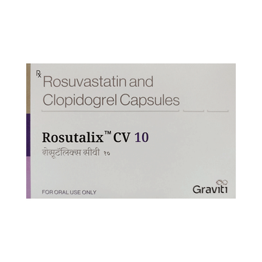 Rosutalix CV 10 Capsule is a combination of two medicines used to prevent heart attack and stroke. This medicine reduces the "bad" cholesterol (LDL) and triglycerides (fats) levels. Moreover, it also decreases the formation of harmful blood clots. This medicine should be taken with food to avoid stomach upset. Lifestyle changes like low-fat diet, exercise, and not smoking may help this medicine to work better. It may change liver function and blood sugar levels, so monitor them properly. This medicine increases your risk of bleeding, so it is important to be careful while shaving, cutting nails, using sharp objects, or engaging in contact sports (e.g. football, wrestling). Stomach pain and constipation are some other common side effects associated with this medicine.