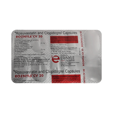 Roznyle CV 20 Capsule is a combination of two medicines used to prevent heart attack and stroke. This medicine reduces the "bad" cholesterol (LDL) and triglycerides (fats) levels. Moreover, it also decreases the formation of harmful blood clots. This medicine should be taken with food to avoid stomach upset. Lifestyle changes like low-fat diet, exercise, and not smoking may help this medicine to work better. It may change liver function and blood sugar levels, so monitor them properly. This medicine increases your risk of bleeding, so it is important to be careful while shaving, cutting nails, using sharp objects, or engaging in contact sports (e.g. football, wrestling). Stomach pain and constipation are some other common side effects associated with this medicine.