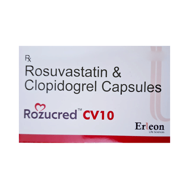 Rozucred CV 10 Capsule is a combination of two medicines used to prevent heart attack and stroke. This medicine reduces the "bad" cholesterol (LDL) and triglycerides (fats) levels. Moreover, it also decreases the formation of harmful blood clots. This medicine should be taken with food to avoid stomach upset. Lifestyle changes like low-fat diet, exercise, and not smoking may help this medicine to work better. It may change liver function and blood sugar levels, so monitor them properly. This medicine increases your risk of bleeding, so it is important to be careful while shaving, cutting nails, using sharp objects, or engaging in contact sports (e.g. football, wrestling). Stomach pain and constipation are some other common side effects associated with this medicine.