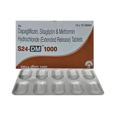 Find out detailed description, uses, directions of use, side effects, warnings and precautions, frequently asked questions about S24-DM 10mg/1000mg/100mg Tablet