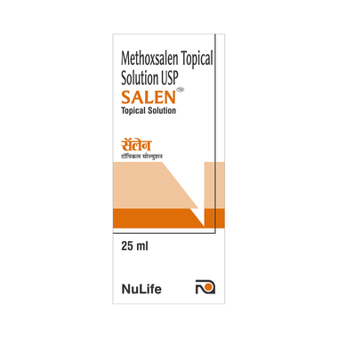 The most common side effects of this medicine include burning, irritation, itching, and redness at the site of application. It may also make your skin sensitive to sunlight, so avoid exposure to sunlight. Employ sunscreens and cover yourself with protective clothing for at least 8 hours after treatment. Salen Solution is not recommended for children below 12 years of age. Avoid eating certain foods like limes, figs, parsley, parsnips, mustard, carrots, and celery, as they may increase the skin's sensitivity to light.