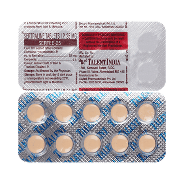 Sertee 25mg Tablet should be taken exactly as prescribed by your doctor. It can be taken with or without food, but it is best to take it at the same time each day to help you remember. Treatment for depression and OCD often takes several weeks before you start to feel the full benefit, so it is important to keep taking the medicine regularly and not stop suddenly, even if you feel better.