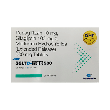 Sgltd-Trio 10mg/500mg/100mg Tablet can be taken with or without food at any time of the day, but try to take it at the same time every day. The dose will be decided by your doctor, so do not stop taking it without asking them. If you do, your blood sugar levels may increase your risk of serious complications like kidney damage and blindness. This medicine is only a part of the treatment program that should include a healthy diet, regular exercise, and weight reduction as advised by your doctor.