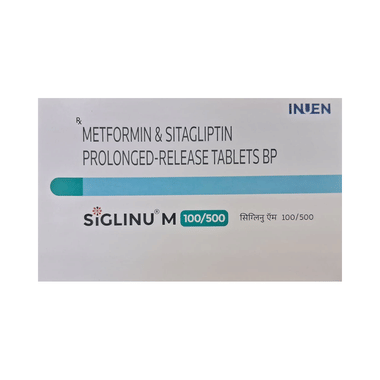 Siglinu M 100/500 Tablet PR is a combination of two medicines: sitagliptin and metformin. This medicine is used in the treatment of type 2 diabetes mellitus. It improves blood glucose levels in adults when taken along with a proper diet and regular exercise. Metformin lowers glucose production in the liver and improves insulin sensitivity. Sitagliptin inhibits the enzyme DPP4 and increases insulin release from the pancreas. This combination is not indicated for patients below 18 years of age.