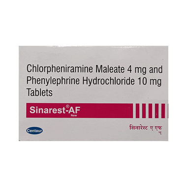 Sinarest AF New Tablet is a combination of two medicines that help to relieve the symptoms of cold. It consists of Chlorpheniramine, an antiallergic that relieves allergy symptoms like runny nose, watery eyes, and sneezing. It also consists of Phenylephrine, a decongestant that narrows the small blood vessels providing relief from congestion or stuffiness in the nose.