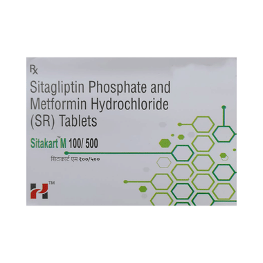 Sitakart M 100/500 Tablet SR is a combination of two medicines: sitagliptin and metformin. This medicine is used in the treatment of type 2 diabetes mellitus. It improves blood glucose levels in adults when taken along with a proper diet and regular exercise. Metformin lowers glucose production in the liver and improves insulin sensitivity. Sitagliptin inhibits the enzyme DPP4 and increases insulin release from the pancreas. This combination is not indicated for patients below 18 years of age.
