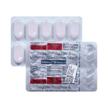 Sitamax M 50mg/500mg Tablet is a combination of two medicines: sitagliptin and metformin. This medicine is used in the treatment of type 2 diabetes mellitus. It improves blood glucose levels in adults when taken along with a proper diet and regular exercise. Metformin lowers glucose production in the liver and improves insulin sensitivity. Sitagliptin inhibits the enzyme DPP4 and increases insulin release from the pancreas. This combination is not indicated for patients below 18 years of age.