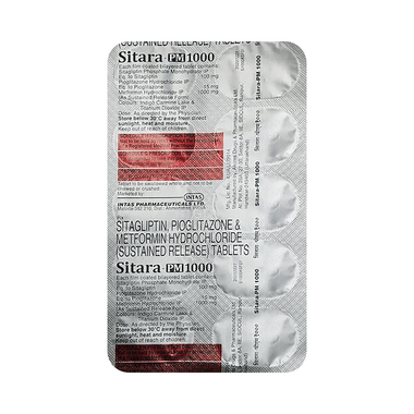 Earlier taking Sitara PM 1000mg/15mg/100mg Tablet, let the doctor know if you have ever had kidney disease, heart or pancreas problems, or drink a lot of alcohol. Pregnant or breastfeeding women should also consult their doctors before taking this medicine. Some other medicines you are taking may also interfere with this combination drug; therefore, make sure your doctor knows about all the other medicines you are using. Limit your alcohol intake while taking this medicine because it can increase your risk of developing low blood sugar levels. You may also need regular tests such as kidney function and blood glucose levels to check that the medicine is working properly.