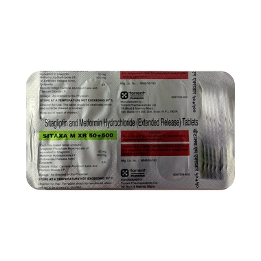 Sitaxa M XR 50+500 Tablet may be prescribed alone or along with other diabetes medications. It works best when used along with a healthy diet and regular exercise. The dose you are given will depend on your condition, blood sugar levels, and what other medicines you are taking. Taking it with meals helps to reduce the chances of developing an upset stomach.