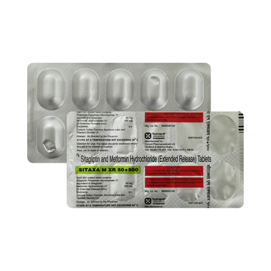 SiTaxa M XR 50+500 Tablet ER is a combination of two medicines that control high blood sugar levels in people with type 2 diabetes mellitus. This helps prevent serious complications of diabetes, such as kidney damage and blindness and may reduce your chances of having a heart attack or stroke.SiTaxa M XR 50+500 Tablet ER may be prescribed alone or along with other diabetes medications. It works best when used along with a healthy diet and regular exercise. Your dose will depend on your condition, blood sugar levels, and other medicines you are taking. Taking it with meals helps to reduce the chances of developing an upset stomach.