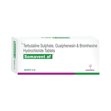 Somavent AF Tablet is used to treat cough. It thins, decreases the stickiness and loosens mucus in the nose and windpipe, making it easier to cough out. It also relaxes muscles of the air passages, thus making it easier to breathe.
