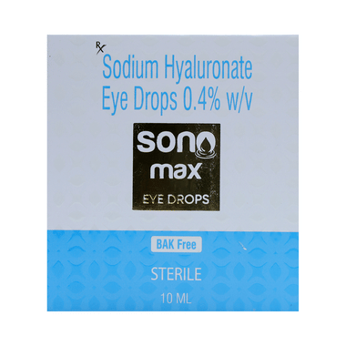 Sono Max Eye Drop is a lubricant. It is used in the treatment of dry eyes. It moistens the eyes and provides relief from discomfort and temporary burning. It also helps in treating corneal burns by forming a soothing layer that reduces irritation and protects the damaged cornea.Sono Max Eye Drop is usually instilled whenever needed. Take the dosage as advised by your doctor. Wait for at least 5-10 minutes before delivering any other medication in the same eye to avoid dilution. Do not use a bottle if the seal is broken before you open it, or if the solution changes color, or becomes cloudy.