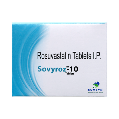 Sovyroz 10 Tablet belongs to a group of medicines called statins. It is used to lower cholesterol and triglyceride levels and reduce the risk of heart disease. Cholesterol is a fatty substance that builds up in your blood vessels and causes narrowing, which may lead to a heart attack or stroke.