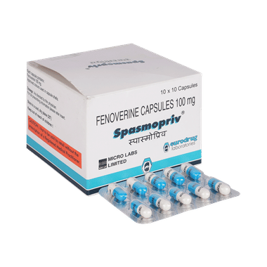 Spasmopriv 100mg Capsule is an antispasmodic medicine used to relieve abdominal pain, cramps, and spasms caused by gastrointestinal (GI) or biliary tract conditions, including irritable bowel syndrome (IBS), colic, and functional GI disorders. It works by relaxing the smooth muscles in the digestive and biliary tracts. This helps to relieve discomfort and pain caused by excessive muscle contractions.