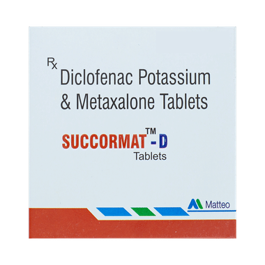 Succormat-D Tablet is a combination of two medicines: Diclofenac and Metaxalone. This combination helps to relieve muscle pain. It works by relaxing muscles by acting on central nervous system and lowering chemical substance in the body that causes pain and inflammation.