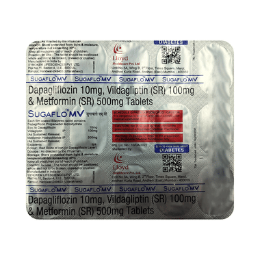 Sugaflo MV 10mg/500mg/100mg Tablet is a combination medicine that helps control blood sugar levels. This medicine is used together with diet and exercise to improve blood sugar control in adults with type 2 diabetes mellitus. It helps in the proper utilization of insulin, thereby lowering the blood sugar level.