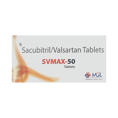Svmax 50 Tablet is a combination of two medicines used to treat heart failure. It works by improving heart function, lowering blood pressure, and reducing the risk of hospitalization and death in patients with long-lasting (chronic) heart failure. It is usually taken along with other heart failure medicines.