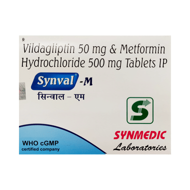 Synval-M Tablet is a combination of two anti-diabetic drugs: metformin and vildagliptin. Metformin is an anti-diabetic medicine and belongs to the class of biguanides. It lowers the glucose production in the liver, delays glucose absorption from the intestines, and increases the body's sensitivity to insulin. Vildagliptin inhibits the enzyme DPP4 and increases the release of insulin from the pancreas. This combination is not advised for patients below 18 years of age.