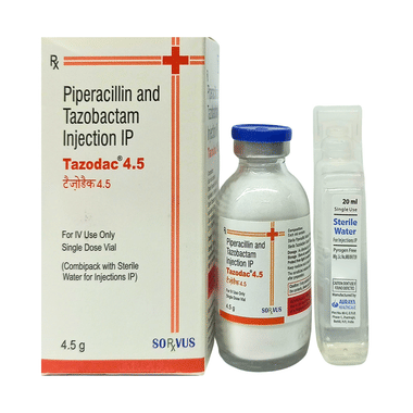 Tazodac 4.5 Injection is a combination of two medicines. It is used to treat bacterial infections like tonsillitis, sinusitis, otitis media, respiratory tract infections, urinary tract infections, boils, abscesses, cellulitis, wound infection, bone infection and oral cavity infections.