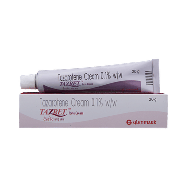 Tazret Forte Cream is a medicine used in the treatment of psoriasis and acne. It works by stopping the overgrowth and thickening of skin cells. Employ it only on the affected areas and do not apply it to the healthy skin.Tazret Forte Cream is for external use only. You should always use it exactly as your doctor has told you. The affected area should be clean and dry before application. You must wash your hands thoroughly before and after applying this medicine. This medicine should be used regularly to get the most benefit from it. Do not use more than you need, as it will not clear your condition faster, and some side effects may be increased. If your condition goes on for longer than four weeks or gets worse at any time, let your doctor know. You can help this medication work better by keeping the affected areas clean.