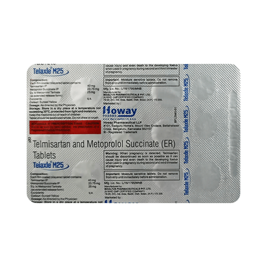 It is advised to take Telaxle-M 25 Tablet ER with food at a fixed time each day to maintain consistent levels of medicine in the blood. Retain taking it for as long as advised by your doctor. Even if you feel well, do not stop this medicine on your own because high blood pressure often has no symptoms. If you stop taking it, your condition may get worse. Retaining active with regular exercise, reducing your weight and eating a healthy diet will also help control your blood pressure. Follow your doctor’s advice while taking this medicine.