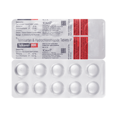Telkonol 80H Tablet contains two medicines, both of which help to control high blood pressure. It is generally used when one medicine alone is not controlling the blood pressure effectively. Lowering blood pressure helps to reduce your risk of having a heart attack or a stroke in the future.
