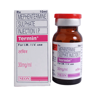 TERmin 30mg Injection is used to raise blood pressure in hypotensive (low blood pressure) states, such as following spinal anesthesia. It increases the blood pressure rapidly by increasing the pumping capacity of the heart and narrowing blood vessels of the heart.