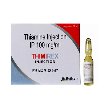 Thimirex Injection is a supplement of thiamine. Thiamine is also known as Vitamin B1. The medicine is used in the treatment of low levels of thiamine in the body. It protects the body from conditions which are caused due to low levels of thiamine such as heart, brain and nerve disorders.