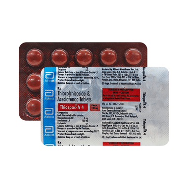 Thiospas-A 4 Tablet is a combination of two medicines: Aceclofenac and Thiocolchicoside. This medication helps in relieving muscle pain. It relaxes the muscles by acting on the central nervous system and lowering chemical substance in the body that cause pain and inflammation.