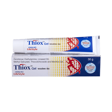 Find out detailed description, uses, directions of use, side effects, warnings and precautions, frequently asked questions about Thiox Gel with Diclofenac Diethylamine & Menthol | For Joint Pain, Neck Pain, Back Pain & Muscle Pain