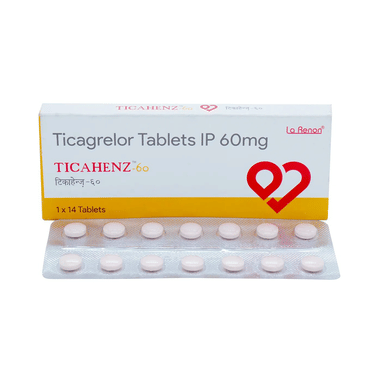 Ticahenz 60mg Tablet is also used to treat people with a recent heart attack or severe heart-related chest pain (unstable angina) who have undergone stenting of the heart. It helps to prevent serious heart-related problems like having another heart attack, stroke, or formation of blood clots in stents in such people.