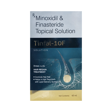 Tinfal 10F Solution is a combination medicine used in the treatment of hair loss in men. It works by increasing blood flow to the hair follicles, which further prevents hair loss and stimulates re-growth, resulting in longer, thicker, and increased numbers of hair.Employ Tinfal 10F Solution in the dose and duration as prescribed by your doctor or as instructed on the label. Immaculate and dry your scalp before using it. It may take several months before you notice any hair growth. The first growth could be soft, colorless, and barely visible. Employ it in the exact dose and duration as prescribed by your doctor. Using more than recommended will not speed up hair growth and may increase the likelihood of side effects. Employ it for as long as the doctor has prescribed to maintain proper hair growth. If your condition does not improve after using it for 4 to 6 months, tell your doctor. This medicine is to be used only by men and is not indicated in women.