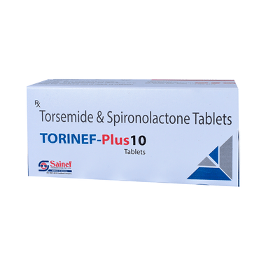 Torinef-Plus 10 Tablet is a fixed-dose combination of torasemide (a loop diuretic) and spironolactone (an antagonist of aldosterone). Both are diuretics, and they help to remove excess fluid from the body. This medicine is prescribed for individuals with edema.