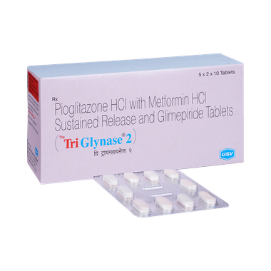 Triglynase 2 Tablet SR is a combination medicine that helps control blood sugar levels. This medicine is used together with diet and exercise to improve blood sugar control in adults with type 2 diabetes mellitus. It helps in proper utilisation of insulin, thereby lowering the blood sugar levels.Triglynase 2 Tablet SR should be taken in the dose and duration as advised by your doctor. It must be taken with food to avoid stomach upset. If you miss a dose, take it as soon as possible. However, if it is almost time for your next dose, skip the missed dose and go back to your regular schedule. Do not double the dose. Overdose may lead to low blood sugar (hypoglycemia).