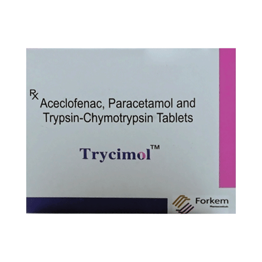 Trycimol Tablet is a combination of four medicines: Aceclofenac, Paracetamol, Trypsin and Chymotrypsin. This medicine helps in decreasing pain and swelling. It lowers the levels of chemical substances in the body that causes pain and swelling.