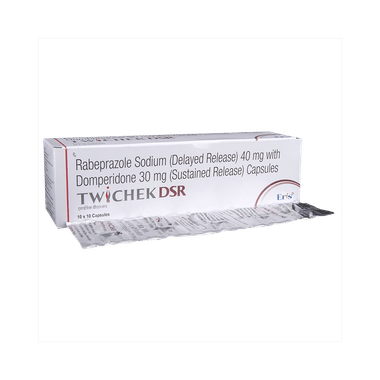 Twichek DSR Capsule is a combination medicine used to treat gastroesophageal reflux disease (acid reflux). It works by relieving the symptoms of acidity, such as heartburn, stomach pain, or irritation. It also neutralizes the acid and promotes easy passage of gas to reduce stomach discomfort.