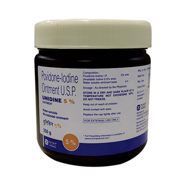 Unidine 5% Ointment is an antiseptic and disinfectant agent. It is used for the treatment and prevention of infections in wounds and cuts. It kills the harmful microbes and controls their growth, thereby preventing infections in the affected area.