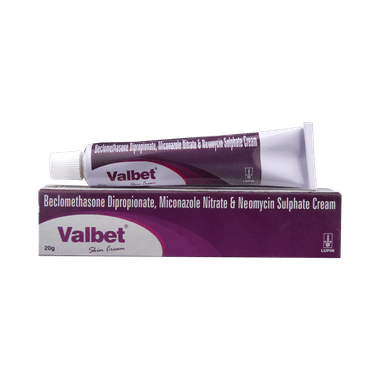 VALbet Cream is a combination medicine that is used to treat various types of skin infections. It minimizes symptoms of inflammation such as redness, swelling, and itching. It also has antimicrobial action against infection-causing microorganisms.VALbet Cream is only meant for external use and should be used as advised by your doctor. A thin layer of the medicine should be applied only to the affected areas of the skin with clean and dry hands. If it gets into your eyes, nose, mouth, or vagina rinse with water. It may take several days to weeks for your symptoms to improve, but you should keep using this medicine regularly. The course of the treatment should be completed to ensure better efficacy of the medicine. If your condition does not improve or gets worse, you should talk to your doctor.