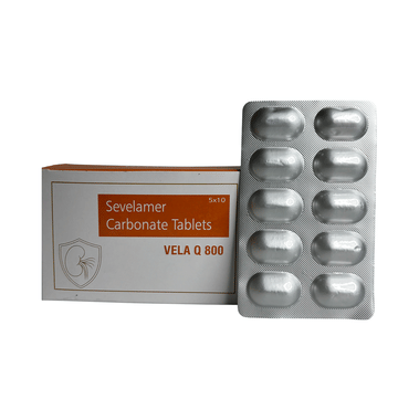 Vela Q 800 Tablet is used to treat increased phosphate levels in the blood. It is used in patients who are on dialysis due to severe kidney disease. It inhibits the absorption of phosphate from the intestine and lowers the phosphate levels in the blood.Vela Q 800 Tablet should be taken with food. Take it in the dose and duration as advised by your doctor. Take it regularly and at a fixed time each day to get the maximum benefit of the medicine.