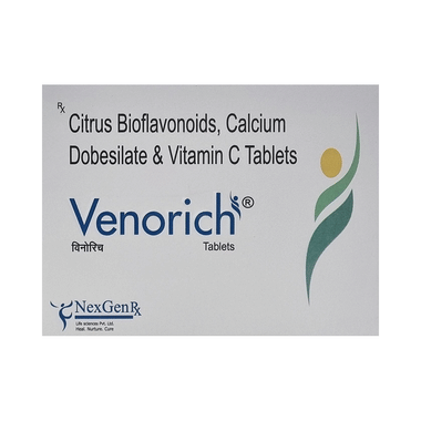 Venorich Tablet is a combination of three medicines used to treat piles and varicose veins. It strengthens the blood vessels, improves blood flow and reduces inflammation and associated symptoms related with the conditions.