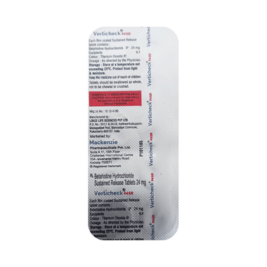 Verticheck 24 SR Tablet is used to prevent and treat a disorder of the inner ear known as Ménière’s disease. The symptoms include dizziness (vertigo), ringing in the ears (tinnitus), and loss of hearing, probably caused by fluid in the ear. This medicine helps relieve the symptoms by reducing the amount of fluid.Verticheck 24 SR Tablet should be swallowed whole with water and taken at the same time(s) each day to get the most benefit. Your doctor will decide what is the correct dose to relieve your symptoms and how often you need to take it. You may need to take this medicine for several months and you should take it for as long as prescribed by your doctor, even if you start feeling better.
