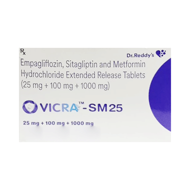 Vicra-SM 25 Tablet ER should be taken exactly as prescribed. It can be taken with or without food. Regular dosing is important to keep blood sugar under control. Do not skip doses or stop without medical advice, as this may cause uncontrolled diabetes. If a dose is missed, take it as soon as remembered, but do not double the dose.