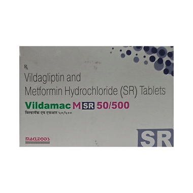 Vildamac M SR 50/500 Tablet is a combination of two anti-diabetic drugs: metformin and vildagliptin. Metformin is an anti-diabetic medicine and belongs to the class of biguanides. It lowers the glucose production in the liver, delays glucose absorption from the intestines, and increases the body's sensitivity to insulin. Vildagliptin inhibits the enzyme DPP4 and increases the release of insulin from the pancreas. This combination is not advised for patients below 18 years of age.