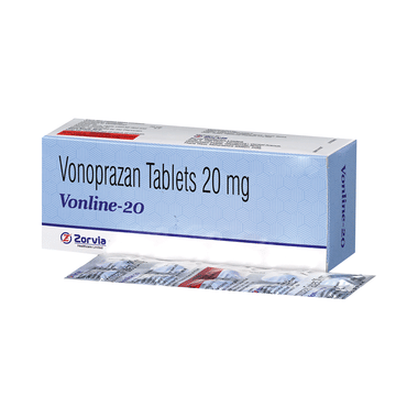 Vonline 20 Tablet is a medication used to treat stomach ulcers and gastroesophageal reflux disease (GERD). It works by blocking the proton pumps in the stomach lining that produce acid. By reducing the amount of acid, it helps to heal ulcers and alleviate symptoms of GERD, such as heartburn and acid reflux.Vonline 20 Tablet may be taken with or without water. Take it exactly as prescribed by your doctor. Try to take it at the same time each day for maximum benefits. Follow your doctor’s instructions regarding diet and other lifestyle changes to support your treatment. Avoid lying down immediately after taking the medication to prevent acid reflux.