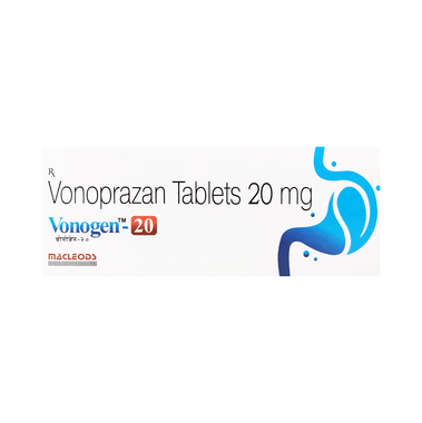 Vonogen 20 Tablet is a medication used to treat stomach ulcers and gastroesophageal reflux disease (GERD). It works by blocking the proton pumps in the stomach lining that produce acid. By reducing the amount of acid, it helps to heal ulcers and alleviate symptoms of GERD, such as heartburn and acid reflux.Vonogen 20 Tablet may be taken with or without water. Take it exactly as prescribed by your doctor. Try to take it at the same time each day for maximum benefits. Follow your doctor’s instructions regarding diet and other lifestyle changes to support your treatment. Avoid lying down immediately after taking the medication to prevent acid reflux.