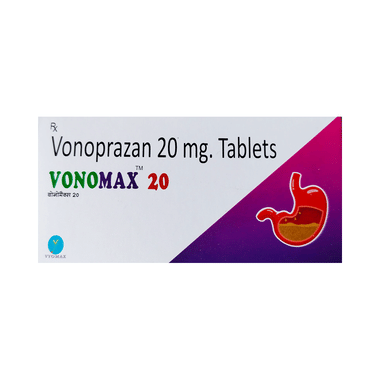 Vonomax 20 Tablet is used to treat conditions where the stomach produces too much acid, such as stomach ulcers and gastroesophageal reflux disease (GERD).