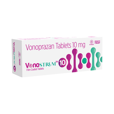 Vonostrum 10 Tablet is a medication used to treat stomach ulcers and gastroesophageal reflux disease (GERD). It works by blocking the proton pumps in the stomach lining that produce acid. By reducing the amount of acid, it helps to heal ulcers and alleviate symptoms of GERD, such as heartburn and acid reflux.